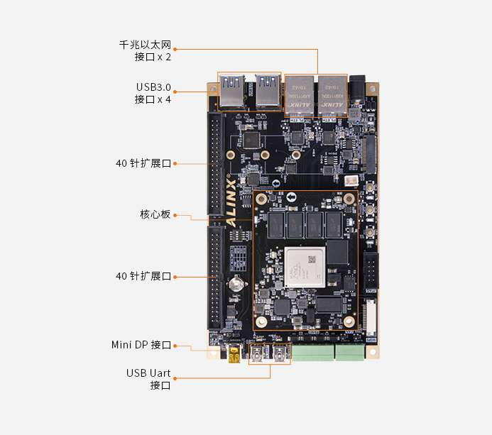 豐富的外圍接口:1 個 FMC LPC 接口、2 路 SFP 光纖接口、HDMI 輸入輸出各1路、1 路 NVME M.2 接口、1 路 DP 接口、1 個 MIPI 攝像頭接口、4 個 USB3.0 接口、2 路千兆以太網接口、2 路 UART 串口接口、1 路 SD 卡接口、2 路 CAN 總線接口,2 路 RS485 接口,支持 AI 智能、云計算、深度學習、網絡通信、高速數據傳輸、視頻圖像處理和工業控制等多領域應用