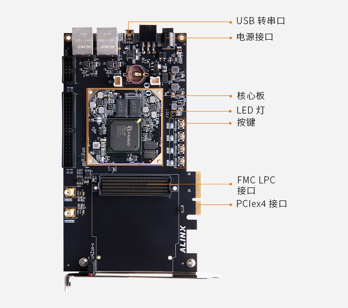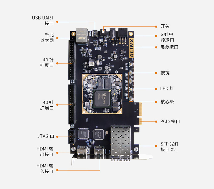 HDMI 輸入輸出接口、光纖通信接口、千兆以太網、UART 接口、攝像頭接口、40-PIN 擴展口、JTAG 調試 滿足視頻圖像處理和工業控制等方面要求