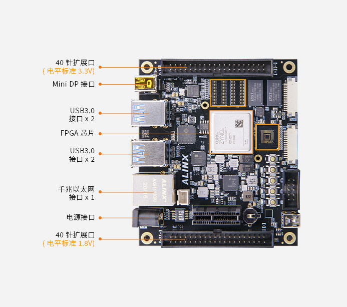 1 路 Mini Display Port 輸出顯示接口,最高支持 4K@30Hz 或 1080P@60Hz 輸出( 可另購 ALINX 定制 DP 轉 HDMI 線 )