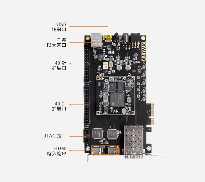 2 個 40 針擴展口 (注:AX7A035僅一個可用),可接 ALINX 各種模塊( 雙目攝像頭,TFT LCD 屏,高速 AD 模塊等 )擴展口包含 5V 電源 1 路,3.3V 電源 2 路,地 3 路,IO 口 34 路